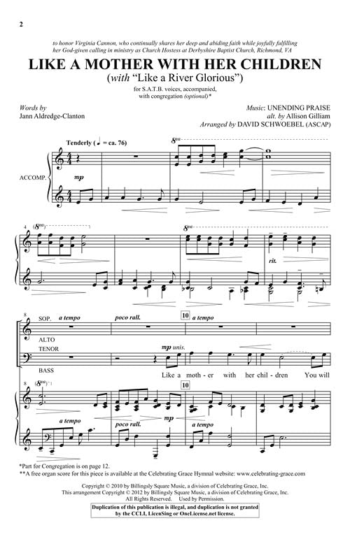 Uses: General, Mother's Day Scripture: Philippians 4:19; Deuteronomy 5:16 Here is an evocative and effective new hymn anthem that integrates Like a River Glorious with a modern text/tune on the comforting nature of God. Comparing the nurture of a caring mother with God's graceful love to us is a beautiful thought to consider, and the arrangement is filled with well-balanced harmonies and flowing piano writing. Duration: ca. 5:16.
