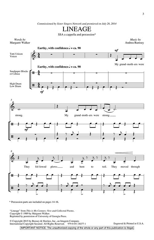 Margaret Walker's text leaps off the musical page as words crying to be sung. My grandmothers were strong. They followed plows and bent to toil. This was not frailty - this was determined womanhood and is reflected in the bluesy organic framework of the piece. With percussion.