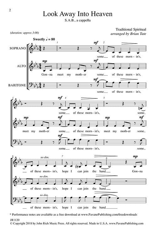 Brian Tate's arrangements are some of the most popular in our catalog. Set for 3-part SAB a cappella choir, this is a great piece that calls to the promised land and the hope that the singer qualifies for entry to see those that went before. For school and church choirs, young and old. The tender ending will capture your heart. Easy to medium.