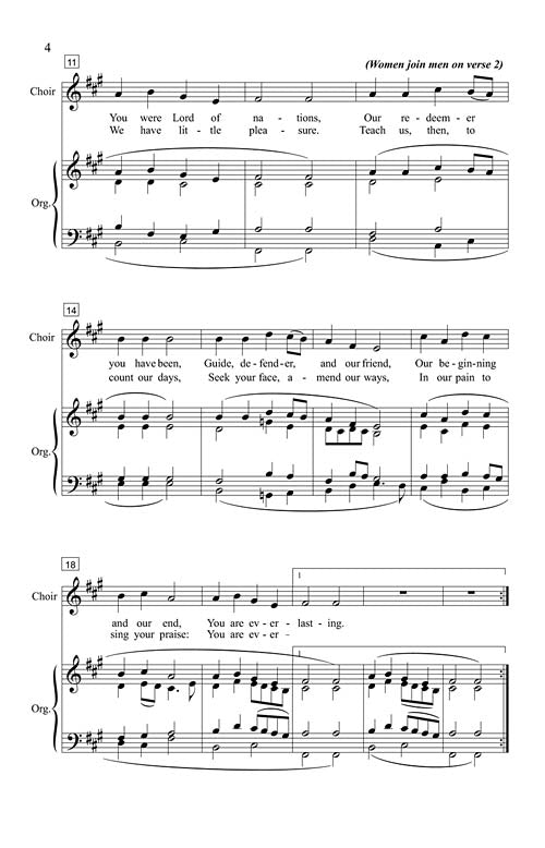 Lord, You've Been Our Dwelling Place is the second of Five Easy Hymn Anthems on Original Texts and Tunes, a collection created as a somewhat delayed reaction to 9/11. The text is a metered reworking of Psalm 90. The music, for either 2-part (any configuration) or 4-part mixed chorus, is composed in the style of traditional Protestant hymn tunes. Congregational participation is optional.