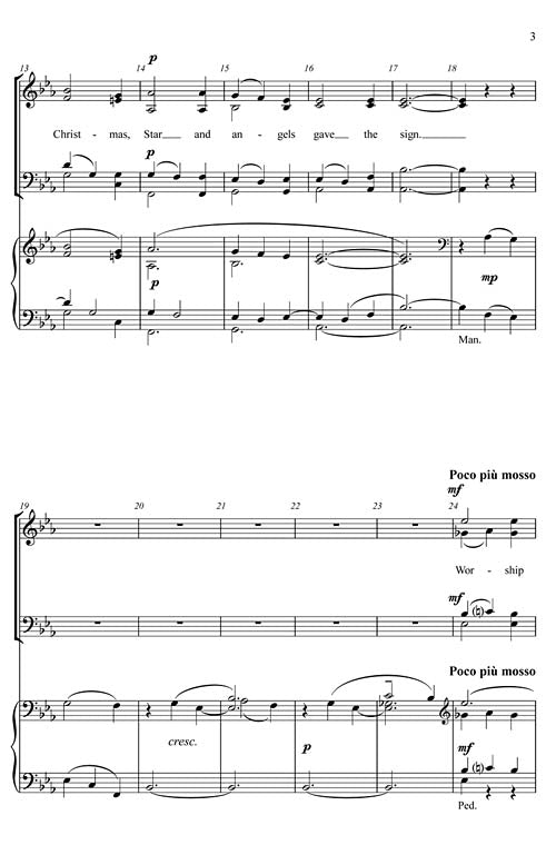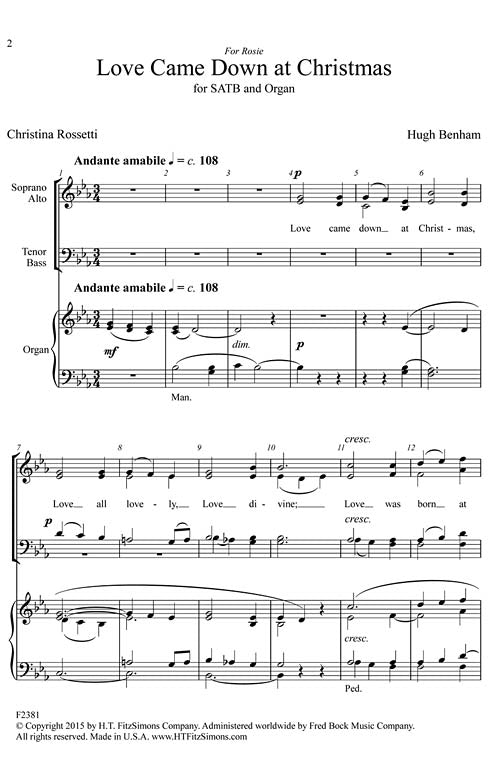 English organist and composer Hugh Benham gives us a fresh and elegant description of this much-loved Christina Rossetti poem. The choral writing is wonderful, chorale-like, with the organ providing graceful support. Hugh calls it a carol/anthem for Christmas or Epiphany, and that says it best. Easy-medium.
