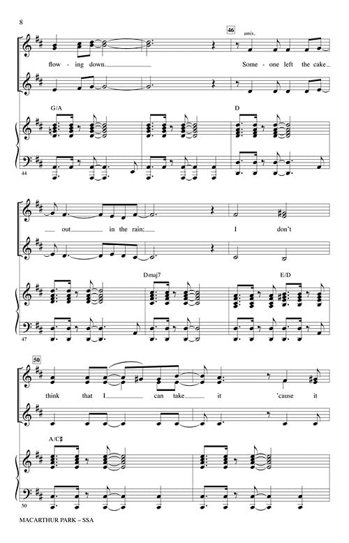 Whichever side of the aisle you may fall on, there is no denying the rightful place of MacArthur Park in pop songwriting's history! The Jimmy Webb-penned masterpiece of impressionism was the solo artist debut of Richard Harris in 1968 and became a number one hit a decade later with the Donna Summer disco-infused single, arranged here for full choir, rhythm section and horns.