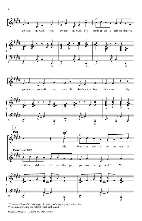 Mango Walk! Unison or optional 3-Part This Jamaican folksong may be sung in unison or in three parts with accessible layered harmonies and delightful percussion and keyboard accompaniment. Irresistible! ScorePlay - click to view score with recording. (https://youtu.be/USWWZc19Sd8) Inventory # : 00139986 UPC: 888680040413 Width: 6.75" Length: 10.5" Height: 0.045" Product Weight: 0.1 lbs. Number of Pages: 20