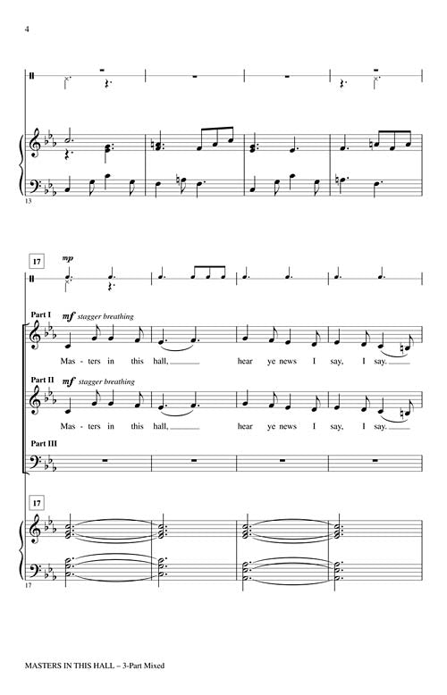 Masters in This Hall Discovery Level 1 3-Part Mixed This arrangement of the traditional French carol is a great confidence builder for young choirs, with bold vocal lines, well-crafted harmonies and optional percussion that can be performed by the singers. ScorePlay - click to view score with recording. (https://youtu.be/beoTVk9haJ8) Inventory # : 00143111 UPC: 888680052652 Width: 6.75" Length: 10.5" Height: 0.036" Product Weight: 0.1 lbs. Number of Pages: 16