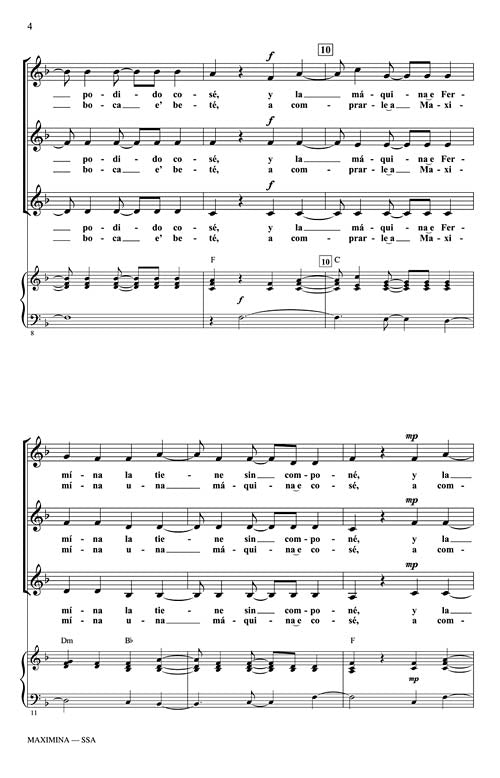 This is a Porro Chocoano from the Chocó region in Colombia's Pacific coast that tells the story of Maximína and a broken sewing machine. A great multicultural choice for mixed and treble choirs! In Spanish, with notes and English translation. Perform it a cappella or add piano, guitar, bass or percussion ad lib. Available separately: SATB, SSA. Duration: ca. 2:30.