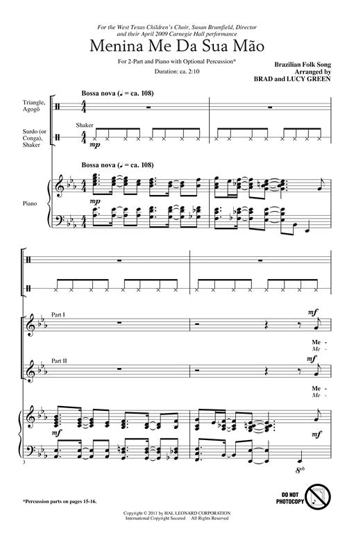 The fresh sounds and flirtacious spirit of a Brazilian bossa nova will capture your heart in this traditional folksong arranged for treble voices! Perform in Portuguese or English or a combination of both, the final tra-la-la chorus will have your audience singing along! Percussion is included and adds flavor!