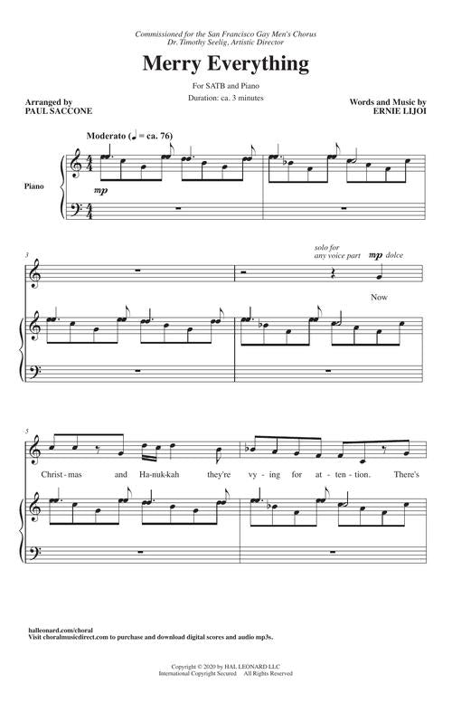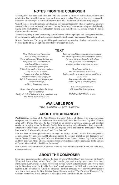 Our differences come to light in a very focused way during December, when we celebrate an entire array of holidays and variety of traditions. Merry Everything addresses the disparate holidays by urging us to celebrate the season together, putting aside our differences, looking toward the things that we have in common. The music is full of joy and laughter. This is a wonderful song for a winter celebration.