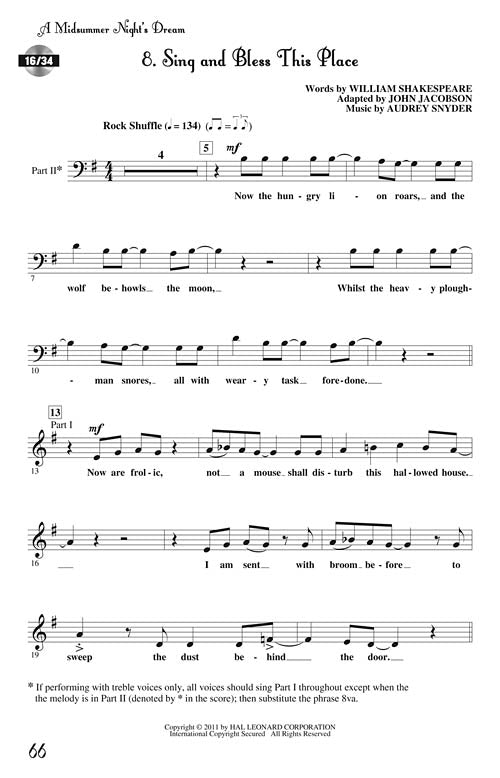 Greetings, lords and ladies! I, William Shakespeare, will be your host this evening and I have a special treat for my thespian friends! You are about to be transported to a land of kings and queens, fairies and nymphs, music and madrigal, and most of all, trickery and love, for love can happen in the strangest ways, especially on a Midsummer Night! Intimidated by the idea of producing a Shakespeare musical play? Nonsense, with this new version, even I'm a piece of cake! You will create an educational and artistic experience your cast and audiences will never forget. I've made it very easy for you! Experience Shakespeare like never before in this fresh, new rendition of the old classic. Designed for grades 6-9, this full-length 60-minute production features five acts with eight original songs in a variety of musical styles from madrigal to rap arranged for 3-Part Mixed, with suggestions for 2-Part Treble voices. The expanded script involves ten major speaking roles, several minor speaking parts and numerous opportunities for non-speaking group involvement. The Director's Guide includes excellent staging and interpretation notes throughout the script, piano/vocal song arrangements, plus additional production, set and costume hints for a successful experience from start to finish. The Libretto/Vocal book features script and vocal parts for your aspiring young actors. Available separately: Director Guide, Libretto/Vocal 5-Pak, Preview CD (dialog not recorded), Preview Pak (1 Libretto/Vocal, 1 Preview CD), Performance/Accompaniment CD (dialog not recorded), Performance Kit/CD (1 Director, 20 Libretto/Vocal, P/A CD). Duration: ca. 60 minutes. Suggested for grades 6-9.