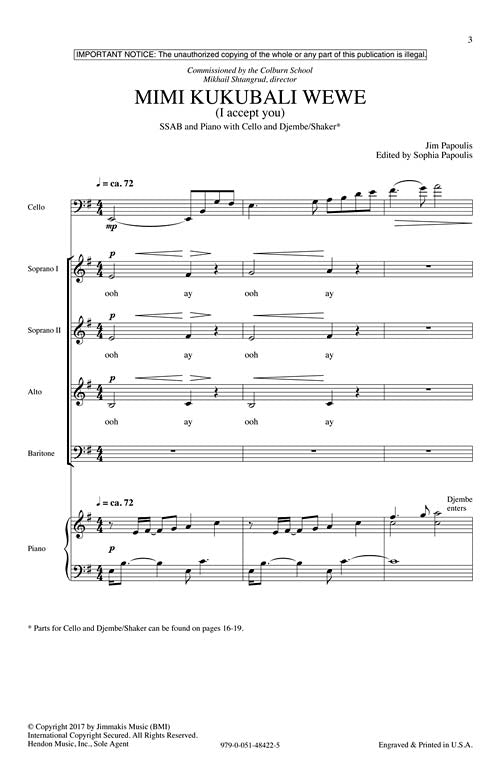 Written as a commission for the Los Angeles Colburn School, this piece is full of joy, celebrating all of our differences as people, and the importance of being accepting, kind souls. The lyrics are in Swahili and English.