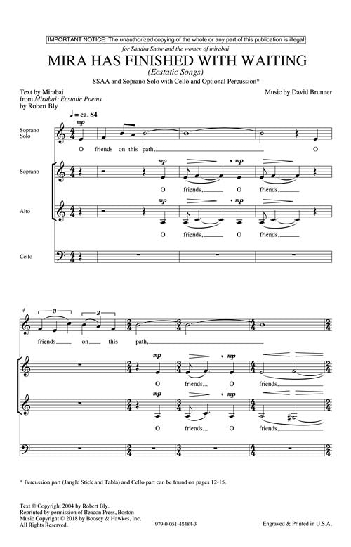 The Ecstatic Songs Cycle was a project with conductor Sandra Snow that spanned eight years. The first song was All I Was Doing Was Breathing (48019949), while the second song Don't Go (48022954) followed four years later. This movement has musical material that seems familiar, melodic gestures similar to those of the previous movements, and the reappearance of the solo cello as the longing in Mira's voice. There is a sense of resolve in her words and in this music.