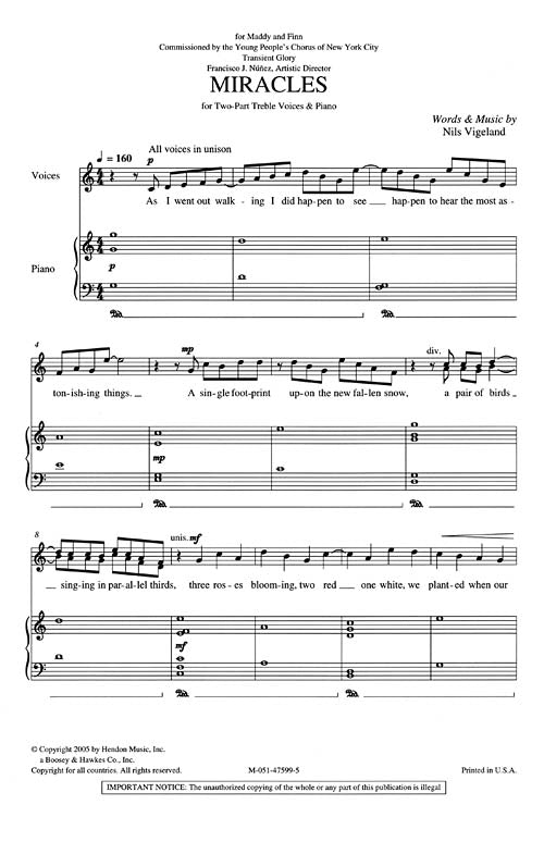 The three miracles of the text, a single footprint in new fallen snow, a pair of birds singing in parallel thirds and three roses blooming in winter express a kind of magic realism somewhere between the possible and the fanciful.