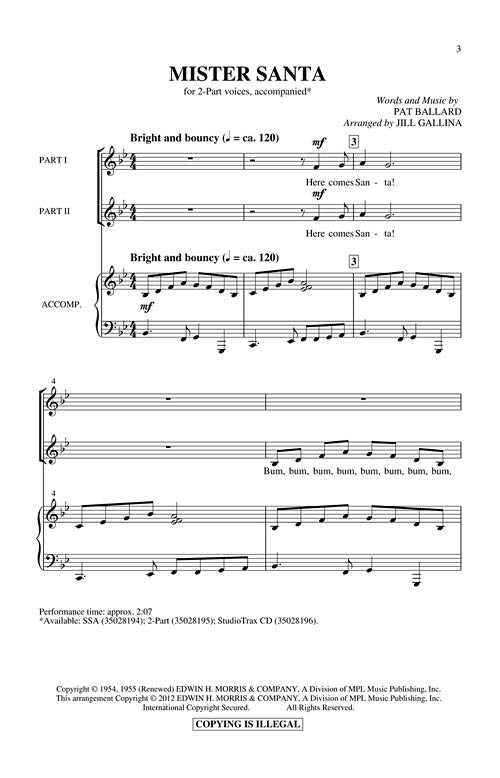 A Christmas nod to Mister Sandman, this Pat Ballard song is a must for the holidays. Perfect for either your 2-part choir or women's ensemble. Complete with bum bum bums, this letter to Santa is sure to entice your listeners - even Scrooge! Available: SSA; 2-Part; StudioTrax CD.