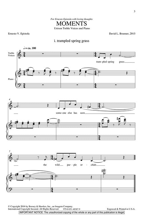 David Brunner, known for his beautiful melodies and wonderful accompaniments, has set seven tiny unison pieces using haiku text. Each of the seven is about seasons and form a set. They are glimpses, sparse, yet fully there, like haiku.