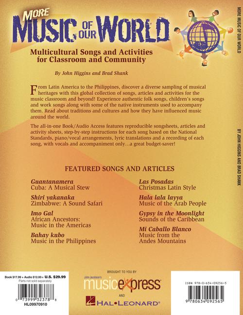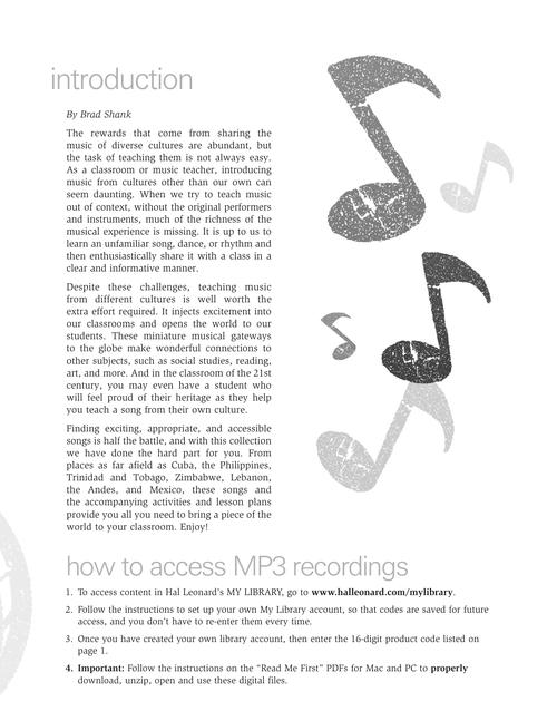 From Latin America to the Philippines, discover a diverse sampling of musical heritages with this global collection of songs, articles and activities for the music classroom and beyond! Experience authentic folk songs, children's songs and work songs along with some of the native instruments used to accompany them. Read about traditions and cultures and how they have influenced music around the world. The all-in-one resource features reproducible songsheets, articles and activity sheets, step-by-step instruction for each song based on the National Standards, piano/vocal arrangements, lyric translations and recordings of each song, with vocals and accompaniment tracks only... a great budget saver! Featured songs and articles include: Guantanamera (The Music of Cuba), Las Posadas (Christmas Latin-Style!), Imo Gal (Instruments from Latin America), Mi Caballo Blanco (Music from the Andes Mountains), Hala lala layya (Music of the Arab People), Shiri yakanaka (Africa: Music and More!), Bahay kubo (Music in the Philippines), Gypsy in the Moonlight (Sounds of the Caribbean). Suggested for Gr. 4-8. Audio is accessed online using the unique code inside the book and can be streamed or downloaded. The audio files include PLAYBACK+, a multi-functional audio player that allows you to slow down audio without changing pitch, set loop points, change keys, and pan left or right.