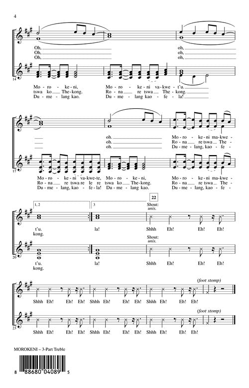Morokeni (Greeting Song) 3 Part Treble A Cappella This traditional greeting/salutation song of the Kwangali and Sotho people, with authentic call and response vocals, djembe, bass drum and shakers will be easily learned and a singer and audience favorite! ScorePlay - click to view score with recording. (https://youtu.be/b9cy7q_5hHM) Inventory # : 00140702 UPC: 888680040895 Width: 6.75" Length: 10.5" Height: 0.006" Product Weight: 0 lbs. Number of Pages: 4
