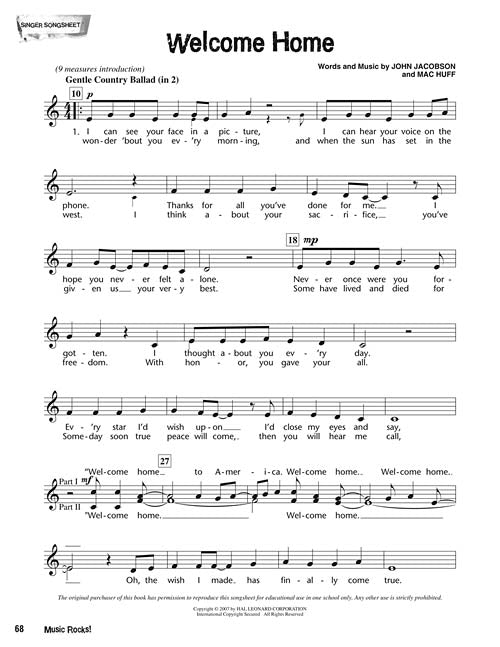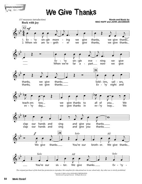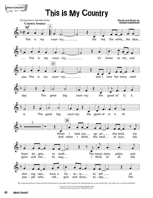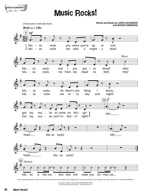 There's a school assembly in 2 weeks and I need to find a song fast! Bring your school together in song for special times this year with music that will inspire, motivate, celebrate, honor and give thanks. Whether you are a music specialist or classroom teacher, this valuable resource is packed with songs that are easy to learn and fun to sing! The collection includes piano/vocal arrangements with movement suggestions and reproducible singer songsheets. For performance options, a CD recording is available separately or in a Classroom Kit. Use the performance tracks with recorded voices for rehearsal, and then showcase your singers on stage with the professionally-produced accompaniment tracks. Rock the classroom - the multi-purpose room - the gymnasium with Music Rocks! Available separately: Collection (with reproducible pages), Performance/Accompaniment CD and Classroom Kit (Collection & P/A CD). Suggested for grades 2-5.