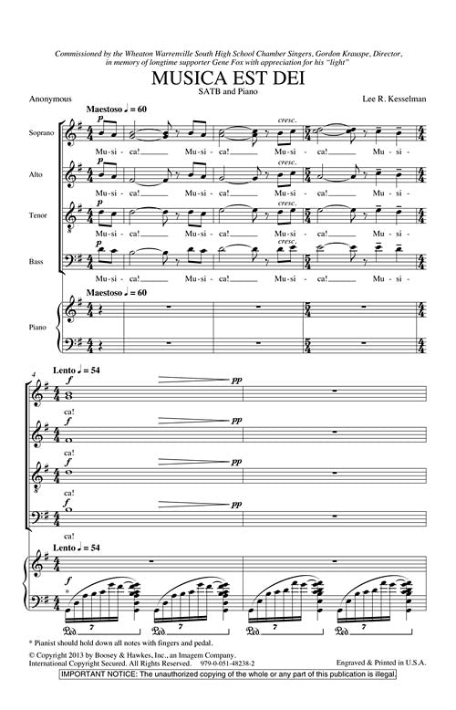 Renaissance composer Orlando di Lasso used this Latin text for one of his works and Lee quotes this musical motive in this new and contemporary composition. The text speaks to the power of music to calm angry souls and uplift sad spirits, to even move the very trees and the wild beasts. This work and the di Lasso would make excellent companion pieces on a concert. Duration: ca. 5 minutes 40 seconds.