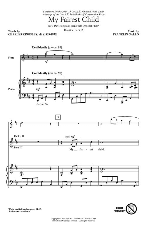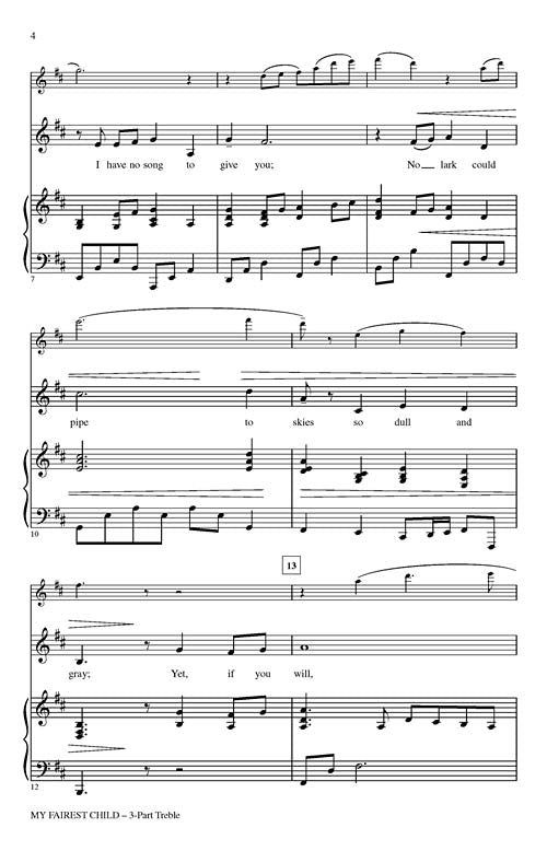 This expansive work for treble voices gives singers the opportunity to develop their full vocal potential and expressiveness. Voices dialog with each other, with the piano accompaniment and with the flute obbligato for an inspired musical offering. Winner of the OAKE composition prize in 2014-15.