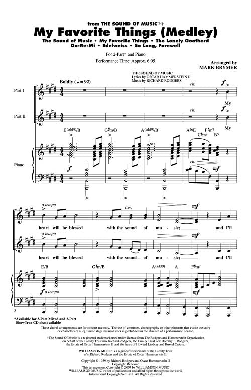 Feature your young singers with this delightful 6-minute medley of the children's songs from Rodgers & Hammerstein's The Sound of Music. Includes: Do-Re-Mi, Edelweiss, The Lonely Goatherd, My Favorite Things, So Long Farewell, The Sound of Music.Available separately: 3-Part Mixed, 2-Part and ShowTrax CD. Performance Time: Approx. 6:05.