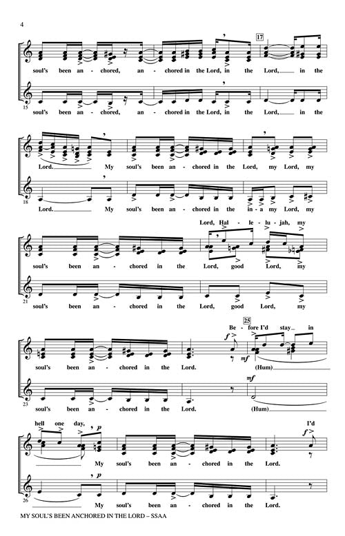 The iconic spiritual arrangement by Moses Hogan has been masterfully adapted for treble voices by Rollo Dilworth. From the powerful opening chords to the exhilarating call and response sections, this is a work that will bring down the house! Available: SSAA a cappella. Duration: ca. 2:45.