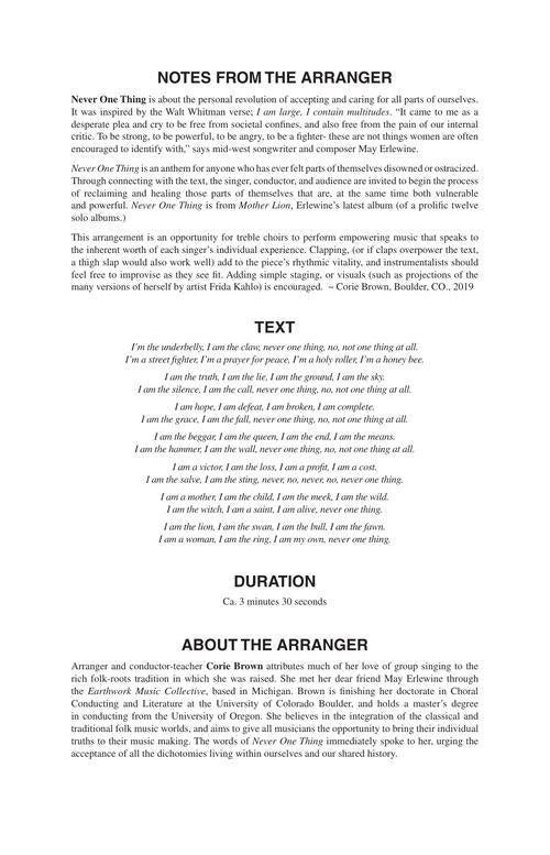 This is an anthem for women's choirs and singers who have ever felt parts of themselves disowned or ostracized. Singer, conductor, and audience are invited to begin the process of reclaiming and healing those parts of themselves that are, at the same time, both vulnerable and powerful. This music is simple and folk-like with optional body percussion.