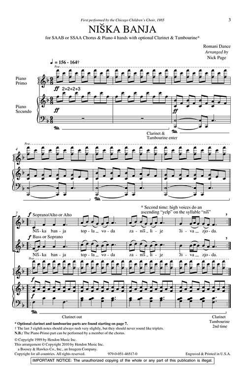 Now available in several voicings, Niska Banja is a Serbian Roma dance popular throughout the Balkans. To Central Europeans, the 9/8 rhythm of 2-2-2-3 is as natural as a 4/4 rock beat is in North America, and rapidly becomes both infectious and quite natural. Piano 4-hands and optional clarinet and tambourine parts included in vocal score. Duration: 1:20.