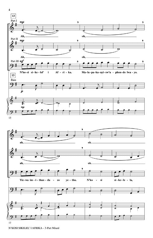 This dignified song by Enoch Mankayi Sontonga (1860-1904) and Sek Mqhayi (1875-1945) is the Pan-African Anthem and is sung throughout the continent. This setting may be sung a cappella, or with chimes and layered percussion.Available separately: SATB (opt. a cappella), SSA (opt. a cappella) and 3-Part Mixed. Parts for Chimes and Bass Instrument included. Performance Time: Approx. 3:00