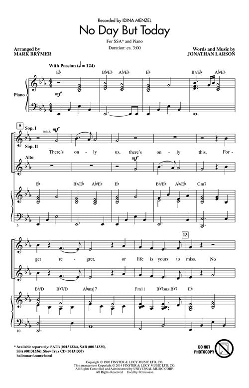 The powerful closer from the landmark musical Rent, this selection is a perfect graduation anthem or concert Finale, with full harmonies and an emotion-filled message. Duration ca. 3:00