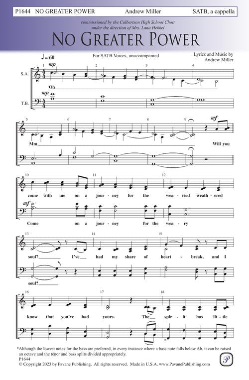 There is no greater power than love, is the message in this song. With a cascade of beautiful suspensions, we are reminded how meaningful it is to love one another and help each other. The combined music and words carry a message of truth that is meaningful and profound. For high school, college, and community choirs.