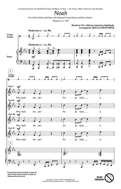 Two African American spirituals Who Built the Ark? and Hoist the Window, Noah combine for a creative telling of the story of Noah. Unison voices moving to call and response, vocal and body percussion ostinati, a gospel piano accompaniment and persistent conga beat shape this festival selection for treble choirs.