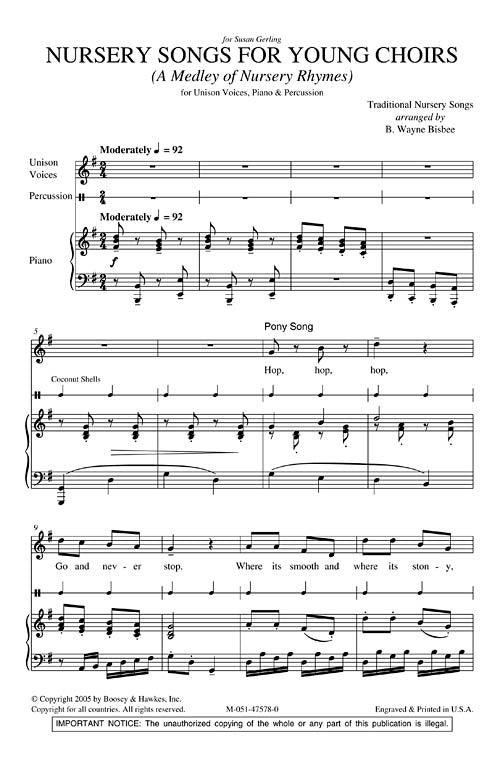 This medley of nursery rhymes is perfect for a classroom of young singers! Simple percussion parts add musical interest to these twelve familiar tunes. With piano.