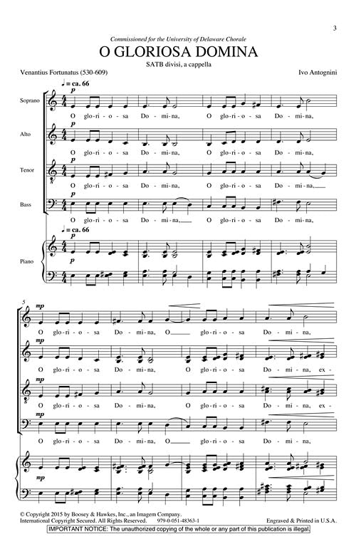 O Gloriosa Domina is divided into three distinct parts: the beginning is in chorale style with sparkling harmonies and surprising chords throughout. A contrasting, fast and very rhythmic middle section follows. The finale recalls the chorale and climaxes in an ecstatic ending. This piece is well suited for advanced choirs.