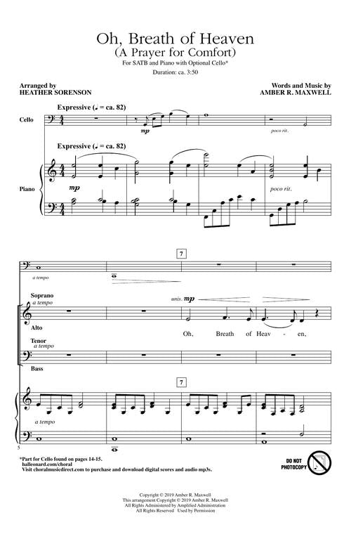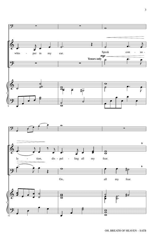 A spirit of reverence and sincerity infuses this sacred song expressing the ministry of the Holy Spirit in the life of the believer. A distinctive piano accompaniment creates an ethereal flow to the anthem's pacing, providing many expressive opportunities for the choir. As the spiritual longing of the singers reaches heavenward, the prayer becomes an impassioned plea. The anthem ends in serenity with the words, Oh, Breath of Heaven, whisper words of peace. Very special!
