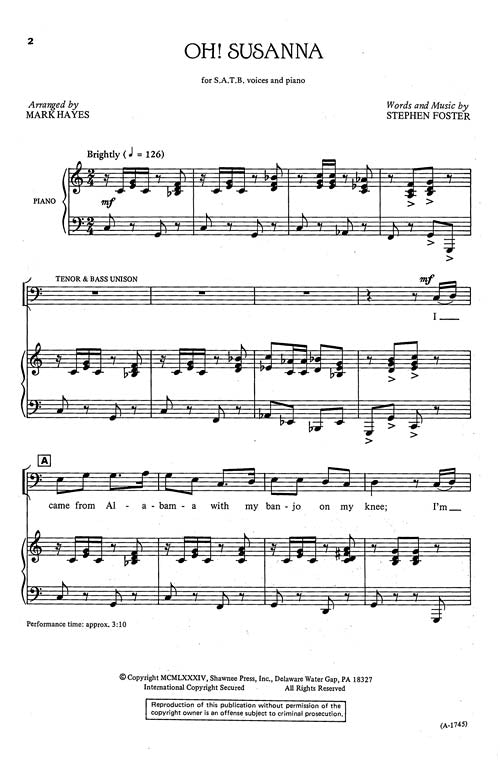 Arranged by Mark Hayes, this familiar Stephen Foster standard is available as SATB, SAB, and 2-part voicings. Mark Hayes has written instrumentation for fiddle, banjo, guitar, bass, and drums. Oh Susanna is bright and upbeat with a few knee slaps making this a strong selection for your folk song teaching and performance needs. Available separately: SATB, SAB, 2-Part, StudioTrax CD, Instrumental parts for guitar, bass/drums, banjo, and fiddle.
