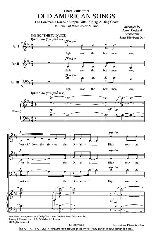 Introduce your choirs to the music of America's best known composer, Aaron Copland. Carefully edited and arranged, it preserves the original accompaniment and makes an excellent concert feature. Includes: Simple Gifts, The Boatmen's Dance, Ching-A-Ring-Chaw. Available for 3-Part Mixed and 2-Part. Performance Time: Approx. 4:35