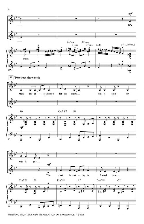 The Lion King, Wicked, Spamalot, The Producers ... all have taken Broadway by storm. Celebrate the magic and music of several recent hits in this 14-minute dazzling medley! Songs include: Always Look on the Bright Side of Life, As if We Never Said Goodbye, The Avenue Q Theme, Be Our Guest, Circle of Life, I Go to Rio, My Strongest Suit, One Short Day, Opening Night, Run, Freedom, Run! and You Can't Stop the Beat.Available separately: SATB, SAB and 2-Part. Instrumental ePak includes parts for Trumpet 1, 2, Tenor Sax/Clarinet/Flute, Trombone, Baritone Sax, Synthesizer, Guitar, Bass and Drums. ShowTrax CD also available. Performance Time: Approx. 19:00