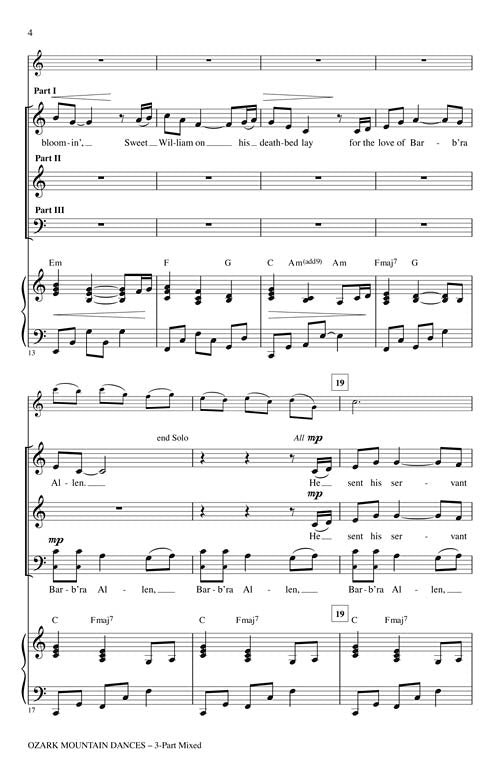 A follow up to the popular Red River Dances and Appalachian Dances, this folk setting from the Ozark Mountains is a colorful and creative showcase for young choirs! From the opening ballad, it moves into rollicking dance tunes that will challenge your singers' diction and are super fun to rehearse and perform! Includes Barbara Allen; Arkansas Traveler; Risseldy, Rosseldy. Available separately: 3-Part Mixed, 2-Part, ShowTrax CD. Duration: ca. 3:45.