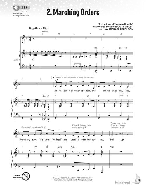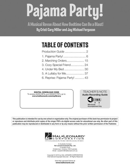 Pajama Party! A Musical Revue About How Bedtime Can Be a Blast! Softcover Audio Online TEACHER BOOK WITH DOWNLD CODE It's time for bed - time to pick up our toys, take a bath time, brush our teeth and put our PJs on to end the day. But wait! What's that noise I hear under my bed? Where's my teddy bear? See how bedtime can really be a blast in this creative and cozy 20-minute musical play for little ones in Grades K-2. The all-in-one performance package includes a Teacher Book with piano/vocal arrangements, simple movement ideas and a helpful production guide. The included audio offers performance and accompaniment-only recordings with a melody instrument to help guide these young singers for a variety of rehearsal and performance options. Teach the songs by rote or, for additional reading challenge, use the reproducible & projectable song and lyric sheet PDFs also found on the enclosed disc. The audio is accessed online using the unique code inside each book and can be streamed or downloaded. The audio files include PLAYBACK+, a multi-functional audio player that allows you to slow down audio without changing pitch, set loop points, change keys, and pan left or right. ScorePlay - click to view score with recording. (https://youtu.be/jcigX5TCilg) Inventory # : 00141499 UPC: 888680044831 ISBN: 1495009718 Width: 8.5" Length: 11" Height: 0.12" Product Weight: 0.3 lbs. Number of Pages: 48