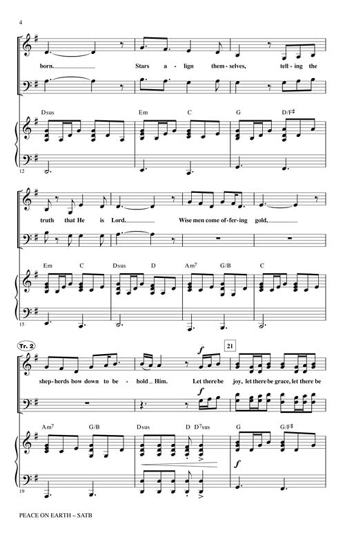 Let there joy, let there be praise, let there mercy among us - let there be peace on earth. Let there be love, let us be one under the Father above us - let there be peace on earth. Available separately: SATB, CD Accompaniment Trax, Orchestration. Duration: ca. 3:25.