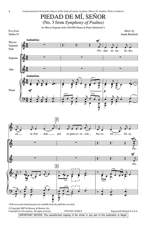 Stunning homophonic choral passages and the plaintive melody of a mezzo-soprano soloist bring this Spanish setting of Psalm 51 to life. From the larger work, Symphony of Psalms, this movement offers a great chance to showcase a well-balanced choir. Optional orchestral parts are available on rental from Boosey & Hawkes. Duration: ca. 7:30.