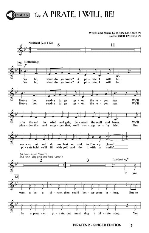 From Captain John Jacobson and Jolly Roger Emerson - ARRRR! Our favorite rascally pirates are back at work, seeking adventure and treasure on the high seas! But a mighty storm rolls in and the pirates find themselves shipwrecked on a deserted island - or is it? Will the King of the High C's have a plan to save the day? Through the course of their musical adventures, they discover that real treasure is something they have plenty of ... friendship and family. Designed for performers in upper elementary and middle school, this 35-minute musical features six original songs, with connecting script and over 20 speaking parts. The Teacher Edition is filled with quality performance material including piano/vocal song arrangements and choreography, script, helpful production guide and teaching objectives linked to the National Standards for each song. For added value, the ready-to-use student books include songs and script, and will enhance the musical experience for your young aspiring actors/singers! Songs include: A Pirate I Will Be, The Storm, The King's Plan, Talent to Burn, Who Cares, We've Got Friends! 35 Minutes.