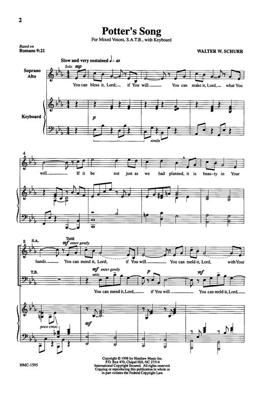 Short and powerful, this work by Walter W. Schurr draws its inspiration from Romans 9:21, one of the most ancient spiritual images in Christendom. Difficulty Level: Medium Middle School, High School or Easy Adult. Duration - 00:02:02.