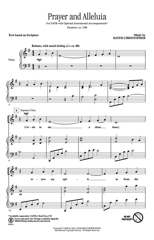 A paraphrase of Psalm 51:10 Create in me a clean heart, O God, is the text for this original anthem by Keith Christopher. The flowing lines and warm harmonies carry this lyric well, providing a meaningful anthem suitable for placement at most any time in the worship service. A ChoirTrax and Instrument Pak (strings/harp) provide additional rehearsal and/or performance options. Available separately: SATB, ChoirTrax CD. Score and Parts for Strings available digitally (88442/harp). Duration: ca: 3:00.