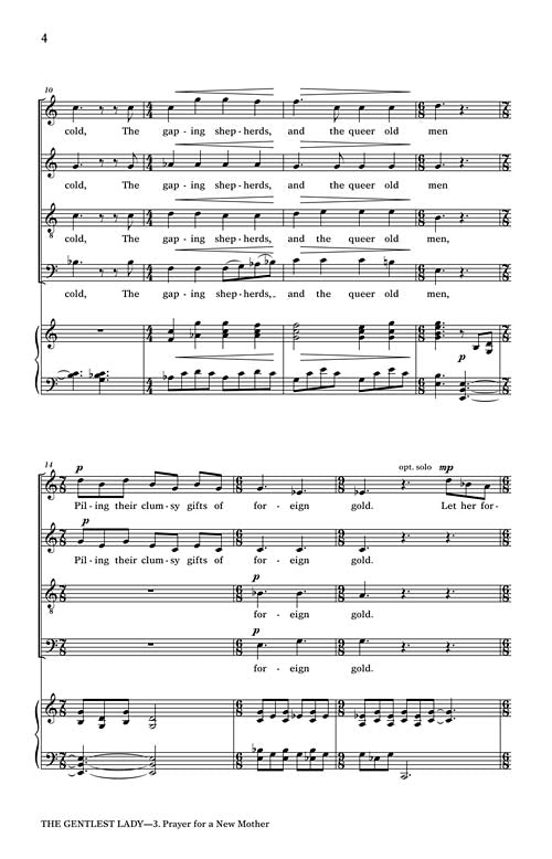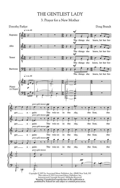 Prayer for a New Mother Craig Hella Johnson Choral Series Publisher: G. Schirmer, Inc. Category: Choral Series: Craig Hella Johnson Series Format: Paperback This 3rd movement in the three movement work The Gentlest Lady by Doug Brandt speaks of hopes that all mothers hope for but the mother of the baby Jesus will never experience. This is strong powerful music with an ending that is quiet and a fitting finale for this movement and the three song set. ScorePlay - click to view score with recording. (youtu.be/MCaRRY2izVU) Inventory # : 50600084 UPC: 888680041823 ISBN: 1495008568 Width: 6.75" Length: 10.5" Height: 0.029" Product Weight: 0.1 lbs. Number of Pages: 12