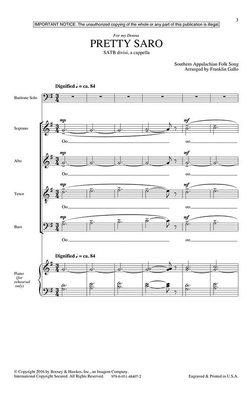 This beautiful folk ballad from 17th century England is haunting and timeless. The lyrics tell the story of an immigrant looking for love in a new and unfamiliar land. Each of the three verses varies in perspective with verse one sung by a baritone soloist accompanied by soaring choral dissonances. The second verse, set in 4-part canon, paints the text, And writes it by the river where the water o'er flow. In the final verse, the soprano solo adds an unsettled sense of agony to the text, And when I get weary, I'll sit down and cry. And think of my Saro, Pretty Saro, my bride.