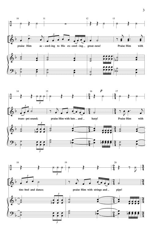 Austin Lovelace gave us many wonderful choral pieces and this setting of Psalm 150 epitomizes his modern style. Open 4ths and 5ths provide a fanfare flavor befitting the praise text of this Psalm. Written for Unison or 2-Part choir it is appropriate for any age choir. The optional hand cymbal adds just the right percussion sonority to complete the statement. Church and school choirs will find this a worthy selection for any time of year. Easy-medium.