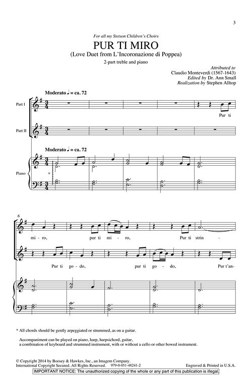 This beautiful duet from Monteverdi's opera L'Incoronazione di Poppea is a wonderful addition to the CME Opera Workshop series. This duet, which occurs at the end of the opera, beautifully illustrates Monteverdi's ability to interweave the vocal lines in a harmonically intriguing way. Ann Small's edition features an ornamented return of the first section of the duet with trills that contain repeated articulation of the same notes, a favored ornament in Monteverdi's works. Duration: ca. 3 minutes 30 seconds.