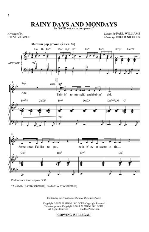 The Carpenters had a hit with this haunting ballad in 1971. Steve Zegree has captured the song's original essence in this arrangement, which is sure to be a stunning moment in your choral concert. Available separately: SATB, StudioTrax CD. Duration: ca. 3:33.
