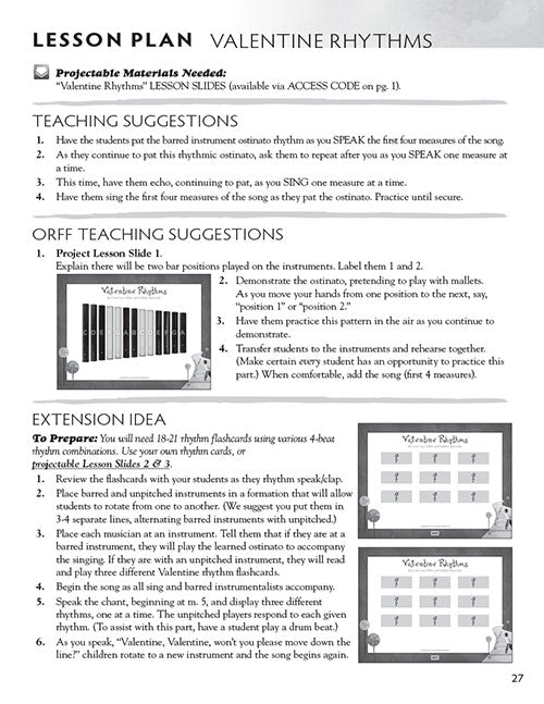 Are you ready for a way to set your students up for music success? Well, let's go Orff! Using Carl Orff's approach of sing, say, dance, play, this collection will give you multiple ways to introduce your children to the world of music making. Within the pages of this resource, you will find songs that involve singing games, Orff and unpitched instrumental accompaniments, simple choreography and extension activities. In addition, there are colorful interactive slides to assist in learning and playing games. The collection features reproducible singer songsheets and step-by-step teaching suggestions for the songs, games and Orff parts. For extra value, projectable, full color song charts are included via digital access and viewed in your browser, so there is no need for special software. Just download the files onto your computer and you're ready to go! These charts include song lyrics and interactive activities for enhanced learning. Songs include: Name Game, 'Round the Circle, Pay Allegiance to America, Little Turkey in the Woods, Decorate the Tree, Make New Friends, Do Your Best, We Are Marching, and more! Suggested for grades 1-3.