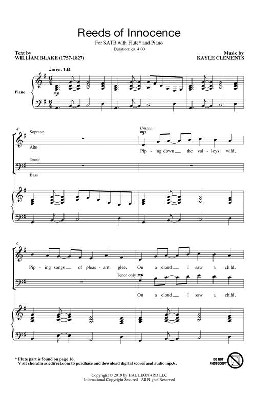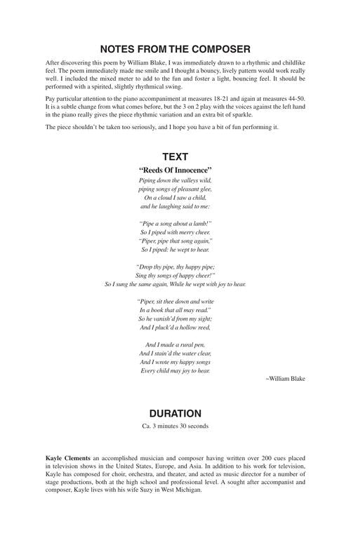 Here is a rhythmic and energetic piece befitting of the childlike poetry of William Blake. Uneven meter and rhythmic play between the piano and the singers add to the innocent joy suggested in the text.